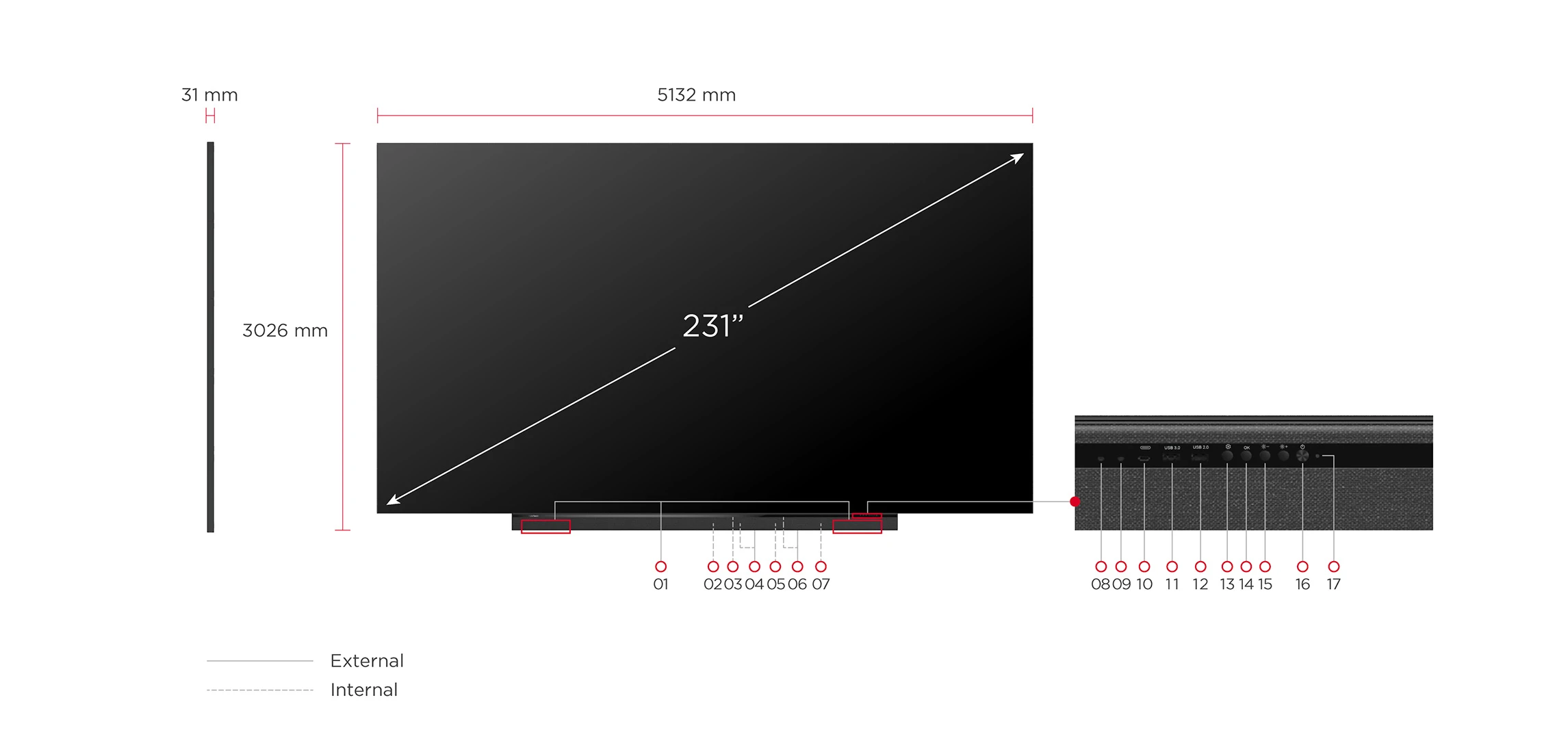 • Product Dimensions (WxHxD) with wall mount: 202.047 x 119.13 x 2.1 inches (5132 x 3026 x 53mm)